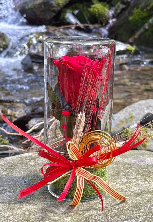 Cúpula de vidrio con rosa y musgo preservado. Medida: 20x9cm