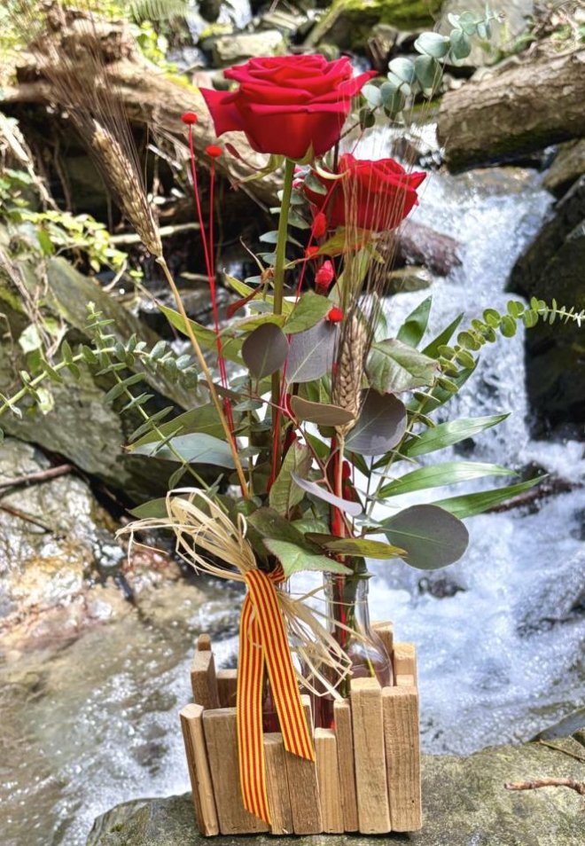 Soporte hecho con madera y botellas de vidrio con dos rosas rojas, verdes de complemento y espiga. Altura aproximada 40cm.