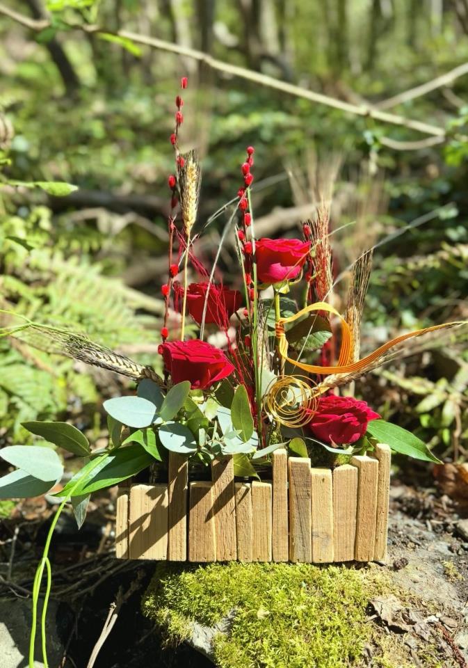 Soporte de madera y base de vidrio con cuatro rosas, verdes variados y espigas. Altura aproximada 30cm.